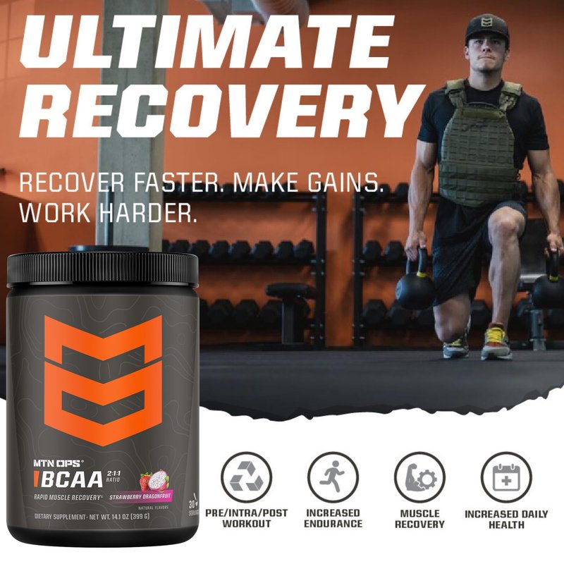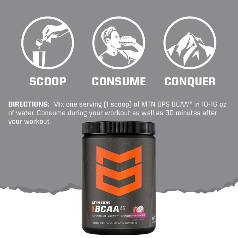 MTN OPS BCAA is a branch chain amino acid formula to aid in lean muscle growth and recovery - before, during, and even after exercising. Designed with the tried and true BCAA ratio of 2:1:1 of Leucine, Isoleucine, and Valine. This scientifically proven ratio gives your muscles the optimum levels needed to aid in protein synthesis which helps your body maintain existing muscle and promote rapid muscle growth while decreasing recovery time. There are no shortcuts when it comes to recovery and building. Give your body the best with the MTN OPS BCAA.