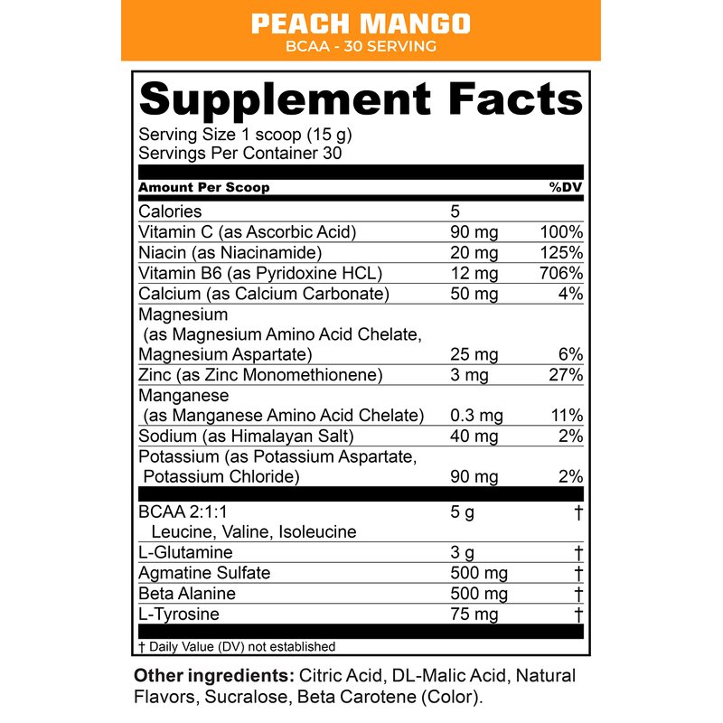 MTN OPS BCAA 2:1:1 Amino Acids Supplement Powder for Rapid Muscle Recovery & Repair with Zero Sugar & Gluten Free (30-Serving Tub, Peach Mango)