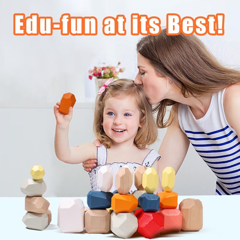 Colorful Stacking Blocks- These wooden rock blocks come in 9 colors. Ample number of different sizes and colors of rocks to meet kids' different stacking needs. The balancing rocks are fun and will keep your kids engrossed for hours! Building Skills-The stones have many flat cutting surfaces so the stones can be stacked and kids can stack the different shapes to the highest point. Unlike ordinary blocks, this wooden stone balancing and stacking game better stimulates children's sense of challenge, develops their hands-on skills, promotes creativity, resilience and perseverance, strengthens fine motor skills, visuospatial skills, and color recognition, thus training logical thinking. Balancing Stone Play- Suitable for almost all occasions: parties, birthdays, festivals, Christmas, etc. It can be played by more than one person, thus increasing the interaction between them. You can use this colorful and attractive educational toy as a coffee table game or class reward etc. Quality Material- The stone balancing blocks are made of high quality pine wood, eco-friendly, natural, safe, healthy and non-toxic. Hand-polished process ensures a smooth and burr-free surface for your kids to play with! Best Gift Choice-More than just a stacking game. Wooden balancing stone toys are a challenging and fun art project. Stacked bricks can also be used as unique home decorations, perfect gifts for children, neighbors, friends, students, kids and families