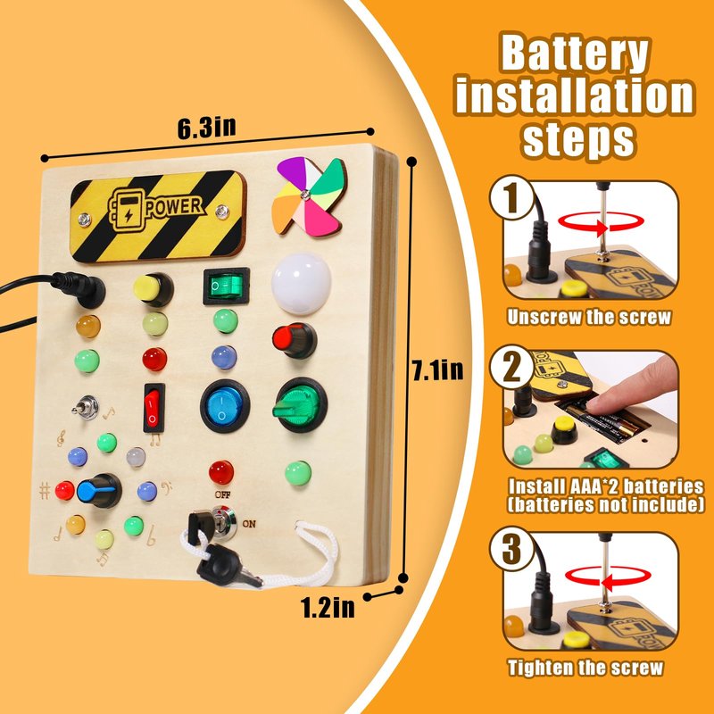 - Ideal Perfect Gift-This Montessori busy board is the perfect birthday Christmas gift for your child. Toddlers can use this toddler busy board to identify different colors and sizes. Designed to turn the boring learning process into a creative and fun one. Please bring your own 2 x 10 batteries before use