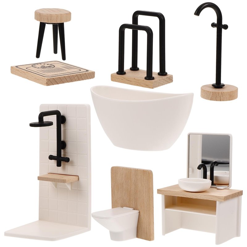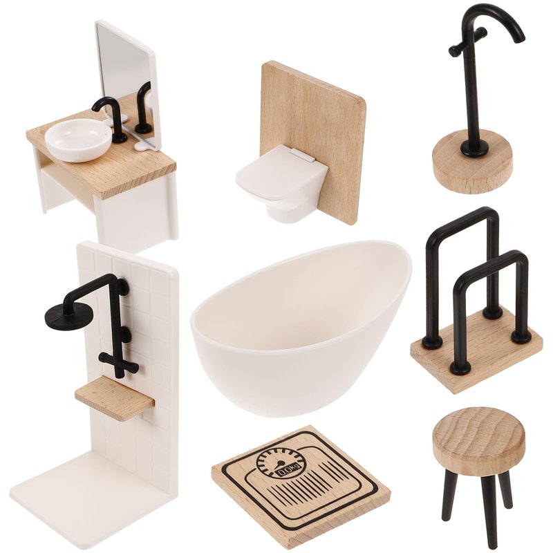 MUCKLILY 8pcs Dollhouse Bathroom Set, 1 12 Scale Dollhouse Toilet Bathtub Wood Bathroom Cabinet with Sink Miniature Furniture for Dollhouse Bathroom Accessories