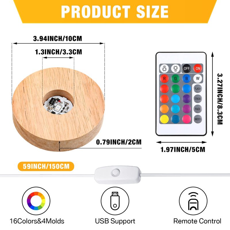 - Package contents: 2 pieces LED display base with 2 pieces remote control; Both with a USB plug, can be operated on adapter power; LED wood light base displays your favorite crystal glass figurine or figurines jewelry or anything within 3.94 inch in diameter