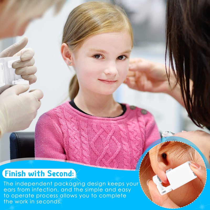 - Instruction: first clean your hands and wipe your ears with an alcohol pad, then mark the point on the earlobe you need to pierce with a pen, arrange in a straight line with the mark with an ear piercing tool, and then press it fast and firmly; The piercing process only takes a few minutes