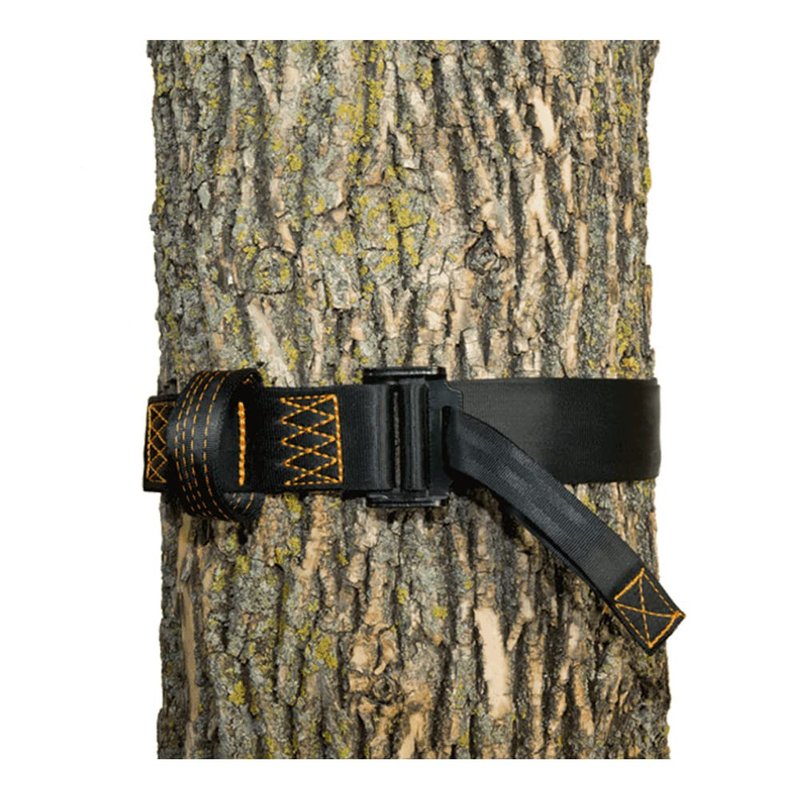 - SAFE USE - Once you climbed the tree and reached the hunting platform this strap is placed around the tree; you then secure the tether from your safety harness to the safety harness tree strap with the carabiner to ensure you are securely in the tree