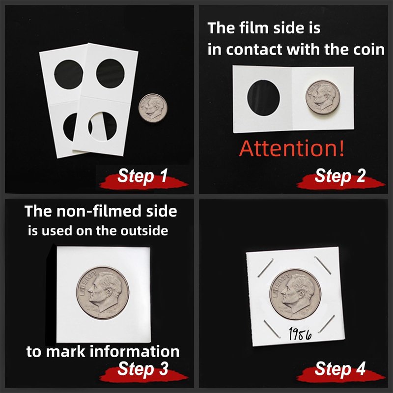 Coin flips 2x2 for cents and small coins, window up to 24.3 mm Non-PVC Mylar window to ensure your coins safe Attention! The non-filmed side is used on the outside to mark information