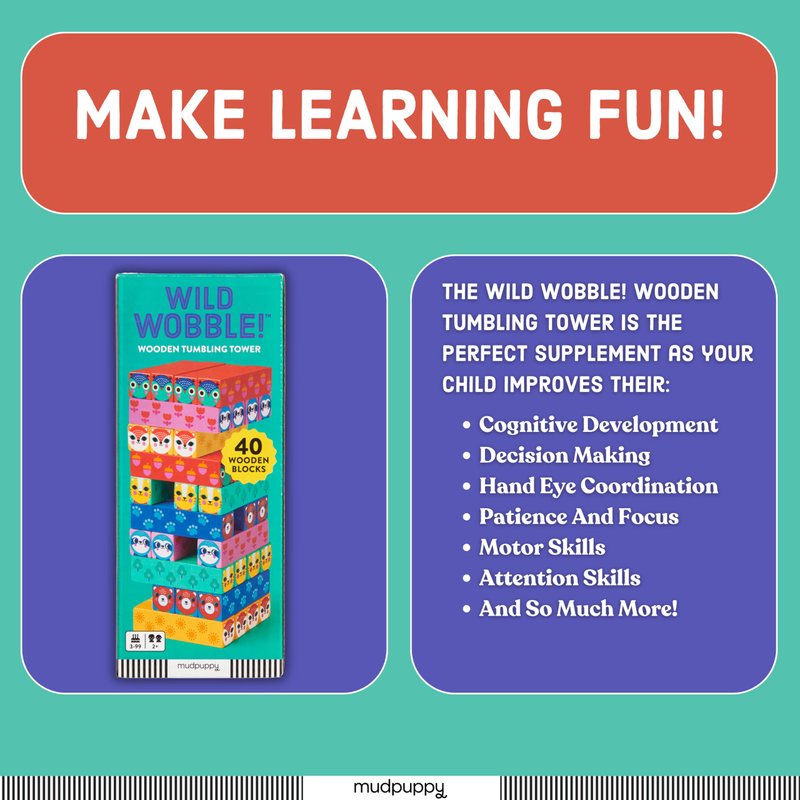 - 🐾Innovative Design: Wild Wobble! By Mudpuppy, a wooden block game for kids, features a unique twist on the classic, with four blocks across and beautiful artwork on each piece, the stacking game encourages creativity and motor skill development.