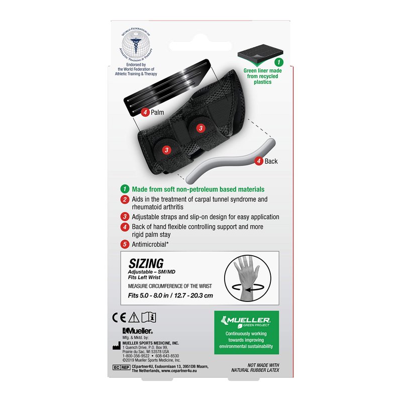 Mueller Sports Medicine Green Fitted Wrist Brace for Men and Women, Support and Compression for Carpal Tunnel Syndrome, Tendinitis, and Arthritis, Left Hand, Black, Small/Medium