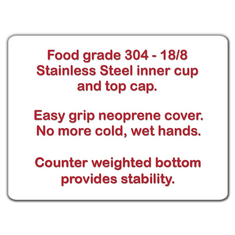 - Cushioned cover affords a secure grip and eliminates condensation and sweating Bottom counter-weighted bottom provides stability