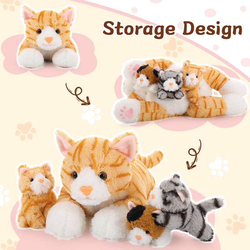 - 【4 Toys in 1】You will receive 1 large mommy stuffed cat and 3 baby cat plush toys. The 16-inch mommy cat stuffed animal has a zipper-back pouch, which can be filled with 3 cute baby plush kittens. The zipper pouch design is very suitable for storage and carrying when going out to play