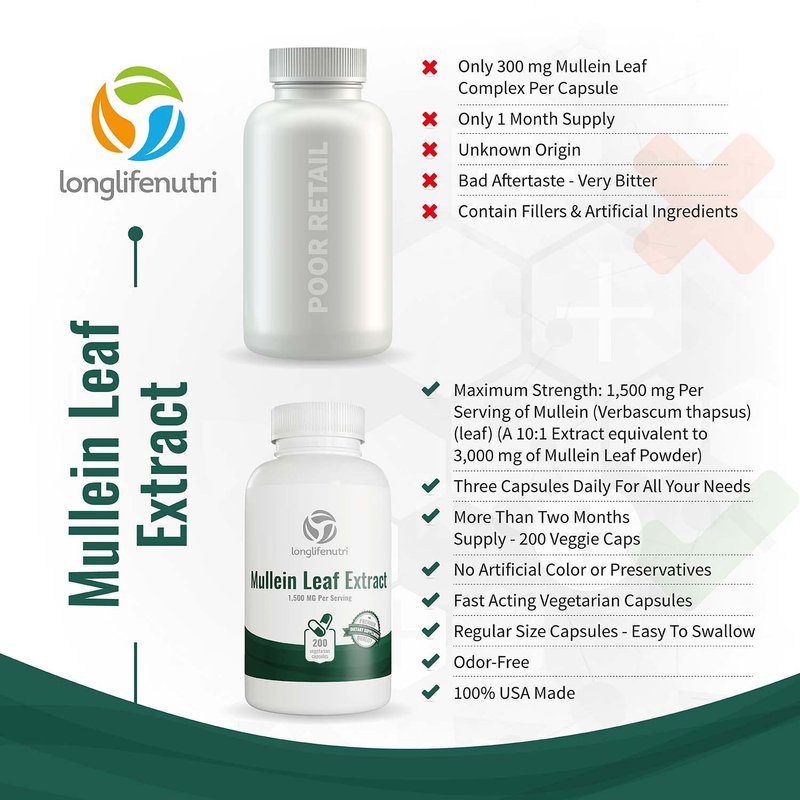 - ✔ BACKED by LongLifeNutri Lifetime Money-back Guarantee: We only develop products that were carefully tested - Buy the best with confidence - Love our Mulein Leaf Pills Complex or get every penny back, no questions asked, it's that easy. Just try our great Mulleim Leaves Cap Tablets.