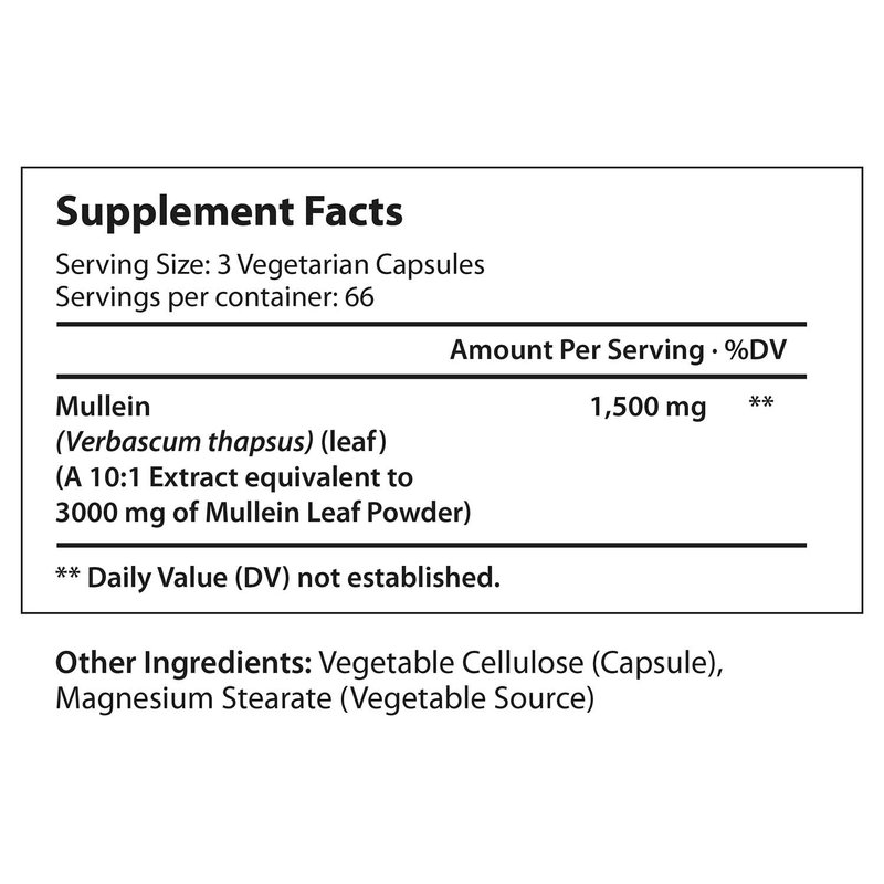 - A 10:1 Extract, equivalent to 3000 mg of Mullein Leaf Powder