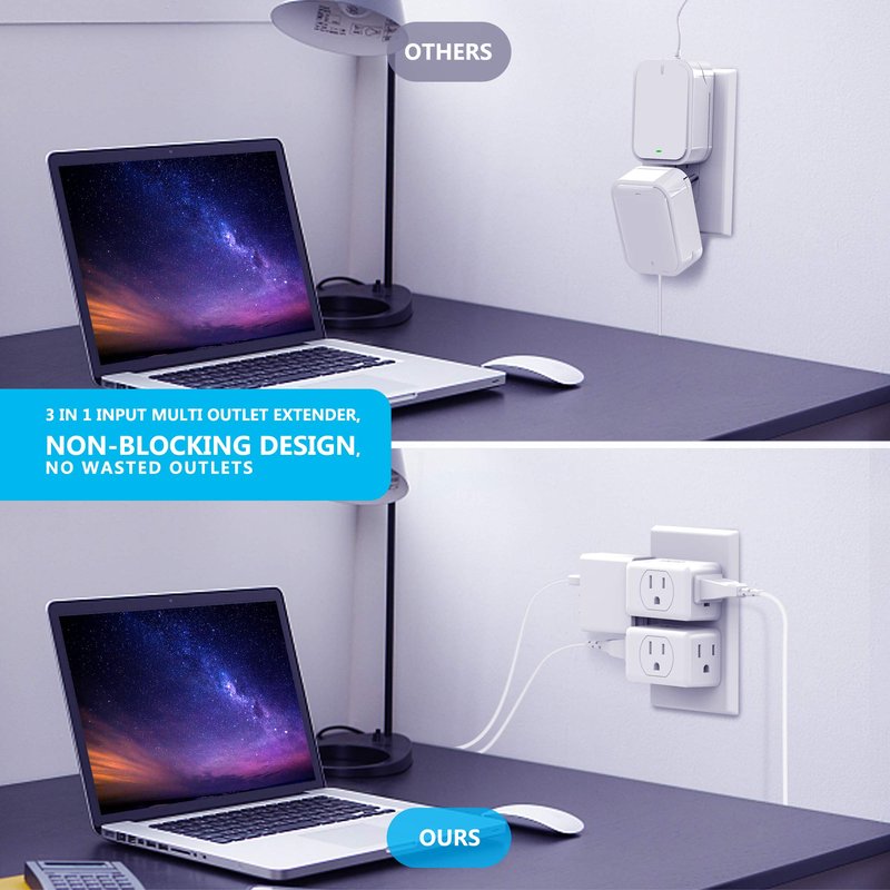 - Multiple Plug Outlet: This wall outlet extender box can make 1 outlet into 3 grounded ones. Accepts standard American 3 prong flat pin plug, and allows you to power 3 devices at the same time without any blocking.