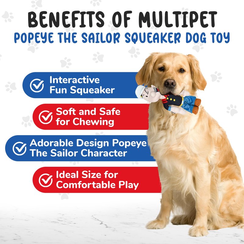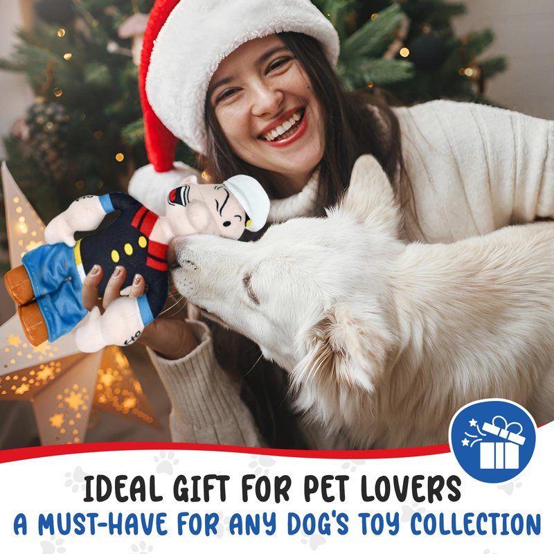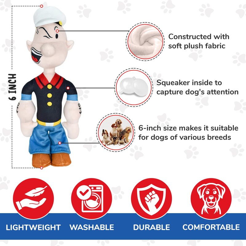 • Iconic Character: Features the iconic cartoon character Popeye the Sailor Man, adding a nostalgic and fun element to playtime. Doubles as a collectible item for Popeye enthusiasts and dog lovers alike, adding charm and character to any pet toy collection.
