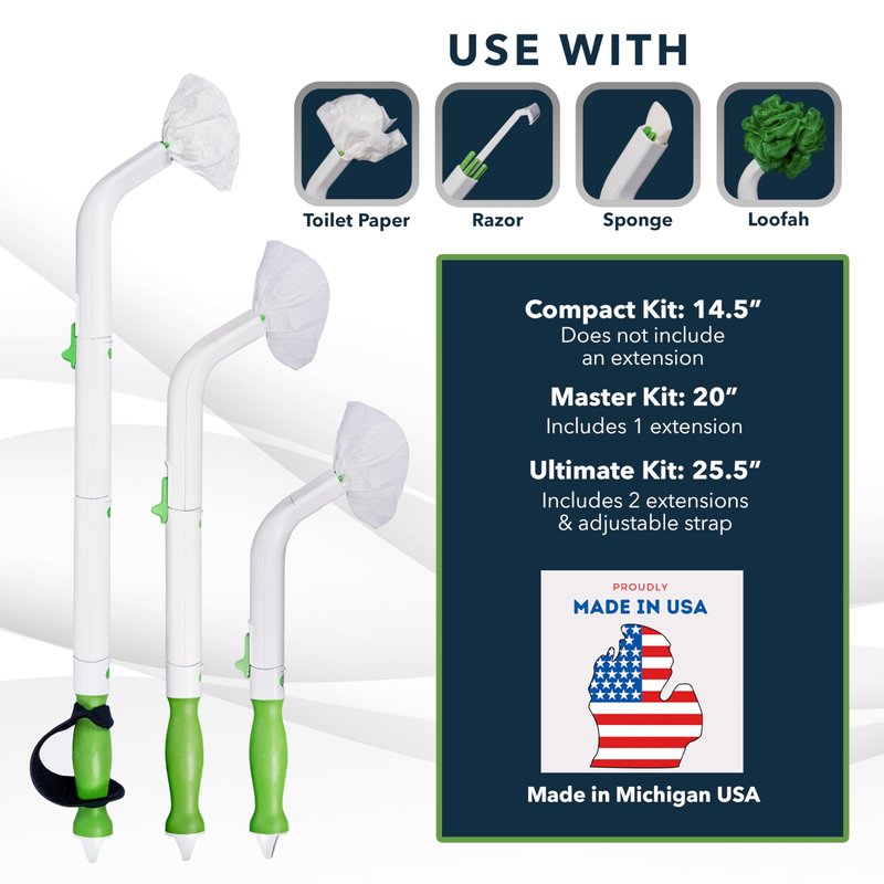 Wiping your butt shouldn’t be a pain in the butt! Freedom Wand is a personal hygiene assistant that allows you to clean yourself after using the toilet and reach hard-to-reach areas of your body independently, even with range of motion limitation. Unlike other brands that can only hold tissue, FreedomWand can also hold other personal hygiene products, such as loofahs, razors, wipes for toilets, and ointment pads. Our kits are available in three lengths. First is the FreedomWand Compact Kit, which is 14.5” long and does not come with an extension. The FreedomWand Master Kit is 20” and comes with one extension, while the FreedomWand Ultimate Kit is 25.5” and comes two extensions and a strap for holding leverage. Additional 4-inch Freedom Wand Extensions and the strap are also available for purchase. FreedomWand has a superior 4-prong grip, so you don’t have to worry about your self care products getting detached. FreedomWand allows you to extend your reach to hard-to-reach areas and crevices comfortably. Additionally, it features a one-touch slide bar to release or hold products with minimal effort. Each FreedomWand Toilet Aid Kit comes with a FreedomWand head, handle, cloth carrying case, and instruction sheet. It also disassembles and stores with the grippers pulled in and can be kept discreetly in its carrying bag when not in use. FreedomWand is travel-friendly, so you can bring them wherever you go. FreedomWand is hygienic and easy to clean – wash it with soap and water while washing your hands. It also features a rinse hole, where you can clean the wiping wand internally if needed. If you’re suffering from spinal/back injuries, arthritis, carpal tunnel, stroke, obesity, or have a limited range of motion, FreedomWand can help you regain independence and dignity. FreedomWand is a 100% woman owned company, and all our kits are proudly made in the USA.