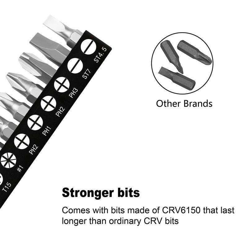 - Extra 10 Popular-Size Bits: Made of CRV6150 (chrome vanadium) steel with hardness of HRC51-55, bits in this set includes #1(2pc), #2, #3 phillips head bits, #1, #2 pozidriv head bits, 4.5mm, 7mm slotted head bits, and T15, T20 torx star screwdriver bits, coming with a cartridge as a good screwdriver bit organizer