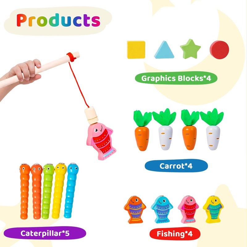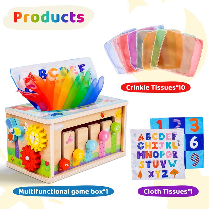 - PACKAGE CONTENTS : This Montessori baby tissue wooden box toy set includes 1 toy box with 6 classic interactive games . Interesting tissue box toy ; Rotating gear learning clock ; Shape matching game;Rotating gear observation ; Pull out the carrots and magnet fishing ; Numeric maze exploration.Additionally , the set contains includes 9 soft and comfortable tissues , 1 special tissue that makes a rustling sound , 5 cute little worm toys , 4 carrot shaped toy blocks , 4 lifelike small fish magnetic toys , 1 fishing magnetic rod , 4 geometric shape matching blocks