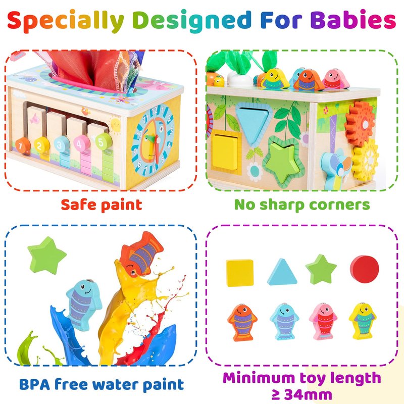 - PRODUCT ADVANTAGES : Compliant with US toy standards , including CPSIA CPC and ASTM F963 . Crafted with care , our 6-in-1 tissue box wooden toy is made from solid wood and adorned with water-based paint . With BPA Free and lead-free materials , the surface and corners are meticulously rounded and polished , ensuring safety for your baby