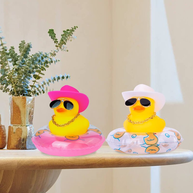 MuMyer 2Pcs Car Rubber Duck Yellow Duck Car Dashboard Decorations Duck Car Ornaments with Alloy Glasses Mini Swim Ring Sun Hat and Necklace for Car Dashboard Decoration Accessories(C-White&Pink)