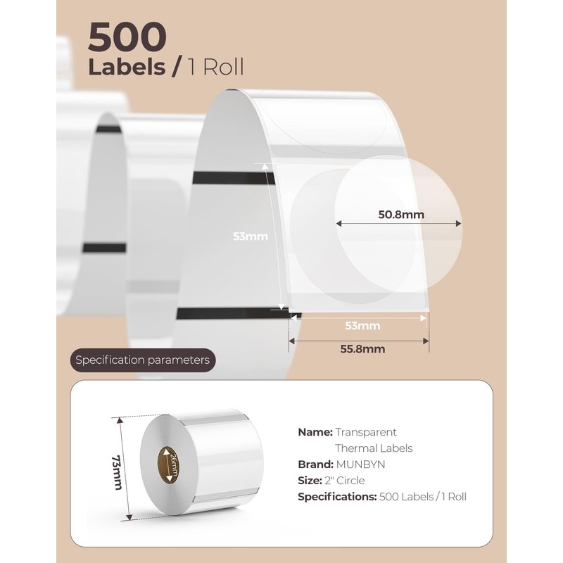 - [Specifications] Authentic Munbyn labels--transparent thermal stickers with actual printable size: 2-inch circle(50.8mm x 50.8mm), printer setting size: 2.09 x 2.09 Inch (53mm x 53mm), paper roll diameter: 2.68"(68mm), 500 labels/roll, 1 roll.
