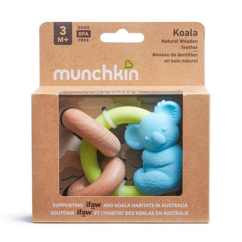 MKTY0808 Rev1 3 m+. 100% natural beechwood with silicone to comfort and soothe. BPA + phthalate free. Hi, I'm a Koala! Australia is my homeland and is the only continent where we koalas live in the wild! I hang out in gum trees. Surrounded by lots of other koala families. I eat so much eucalyptus that you can smell it in my fur & breath! When I was a Joey (another name for baby koalas here down under) I spent my first 9 months carried in a pouch on my mommy's tummy. It's the little things + IFAW. www.munchkin.com. www.ifaw.org. Supporting IFAW and koala habitats in Australia. On behalf of you and your little ones, Munchkin has made a donation to the International Fund for Animal Welfare (IFAW). We love you for your support. To learn more or donate, please visit www.ifaw.org. BPA free. Made in Indonesia.
