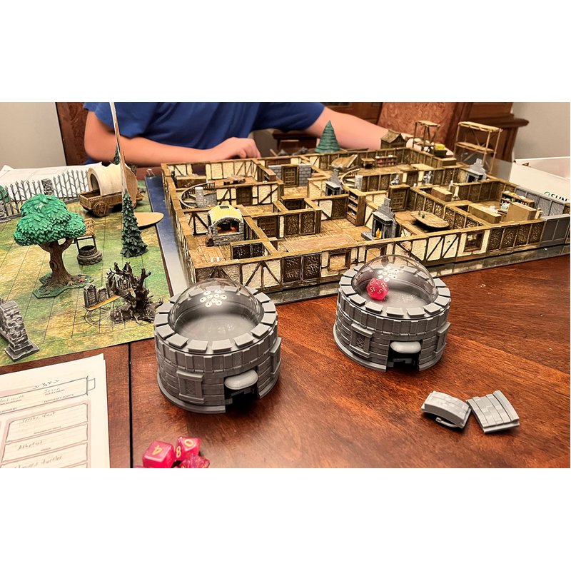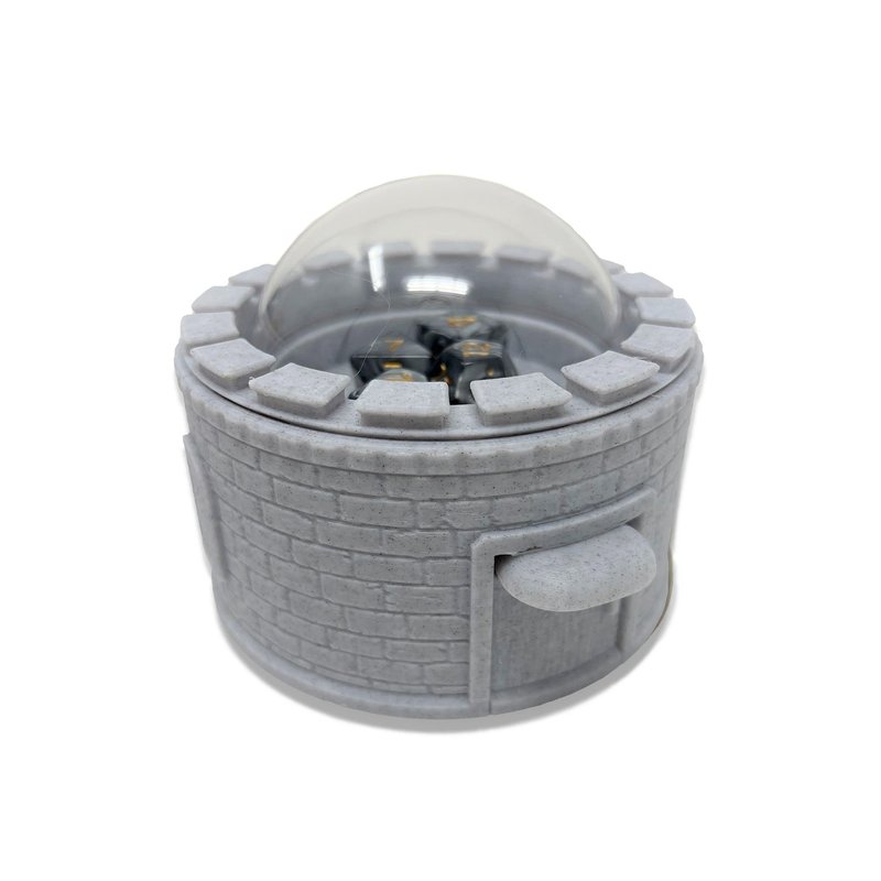 This RPG table top style castle dice popper can roll up to 5 dice at a time and hold up to 21 dices in its storage compartment. Its design is convenient for quick loading and unloading of dice. Useful for keeping dice clean and for multi rolling scenarios, this dice popper is a great addition to your collection or as a gift to a fellow party member.