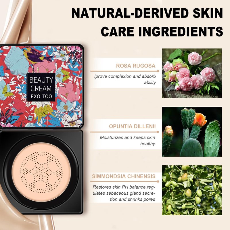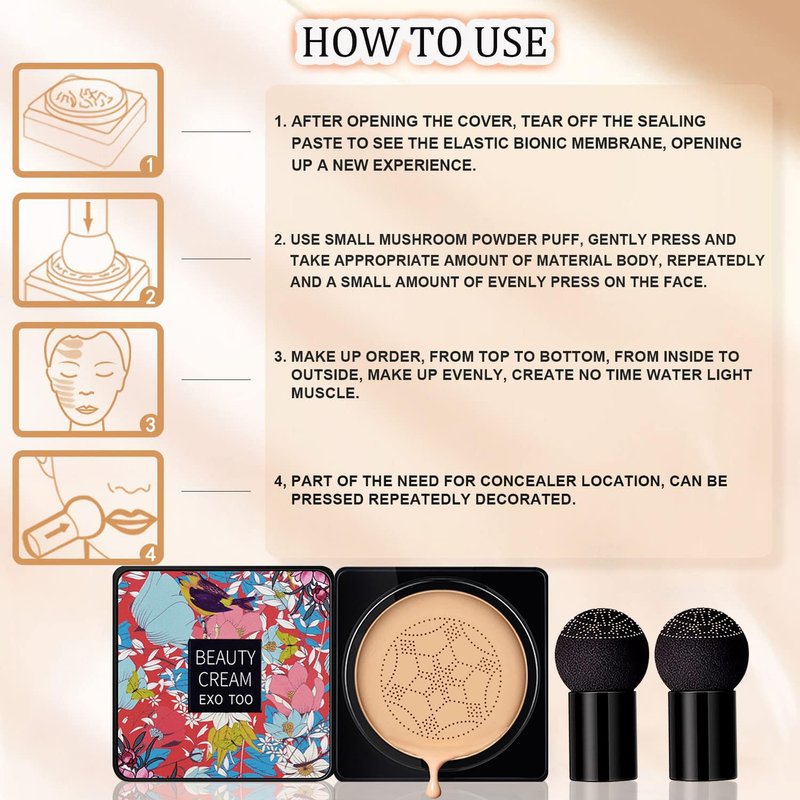 - PACKAGE INCLUDES:1 x Beauty Cream EXO TOO & 2 x Mushroom Head Sponge. The portable air cushion CC cream corrects facial imperfections and enlarged pores, and the specially designed skin-friendly mushroom head sponge puffs apply evenly and quickly