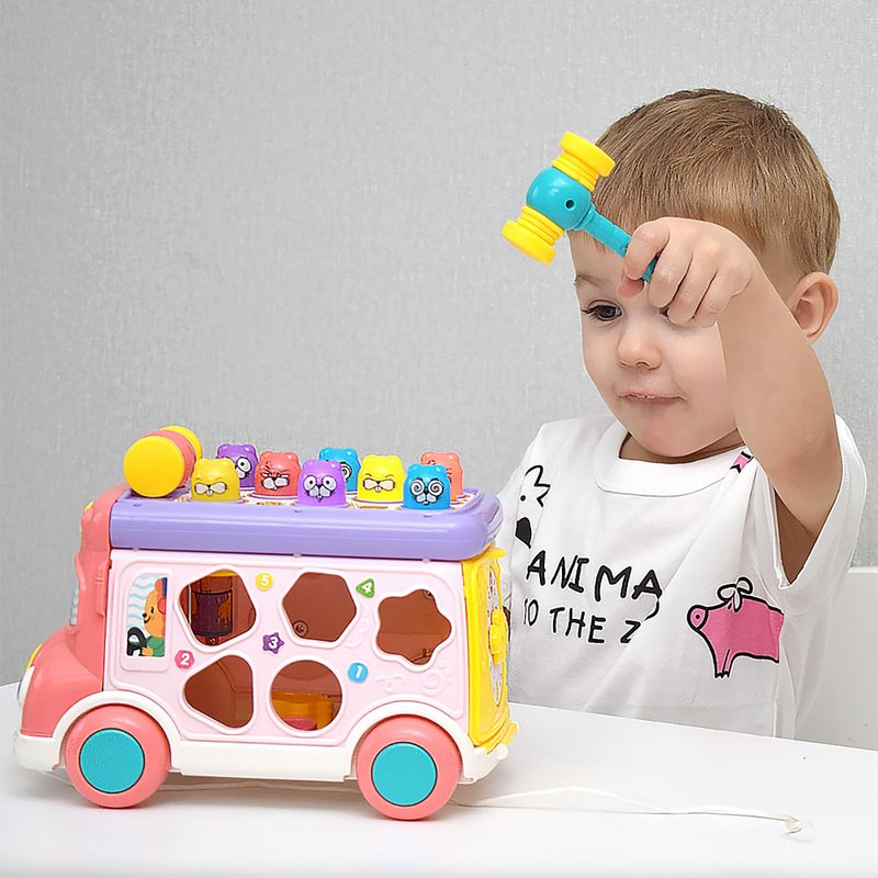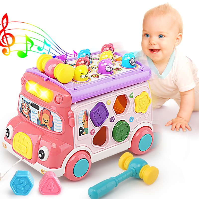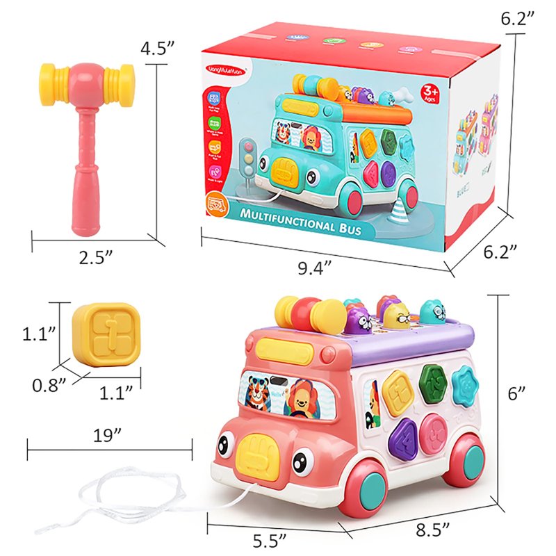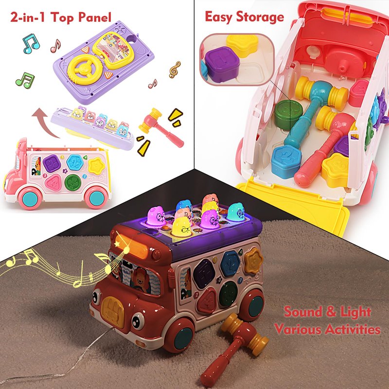 - Multifunction: The music baby bus features five sides of fun activities, including shape sorters, gear linkage, whack-a-mole game, animal matching, steering wheel, push & pull and toy clock