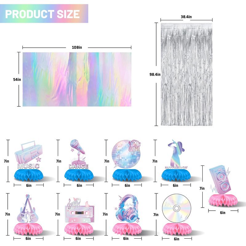 - Popular Birthday Party Decorations for Women and Girls: Birthday decorations set include Happy Birth-Tay Banner,Birthday Tablecloths,2pcs Silver Metallic Tinsel Foil Fringe Curtains,9pcs Honeycomb Centerpieces,Music party theme decoration is a choice for a birthday party decor
