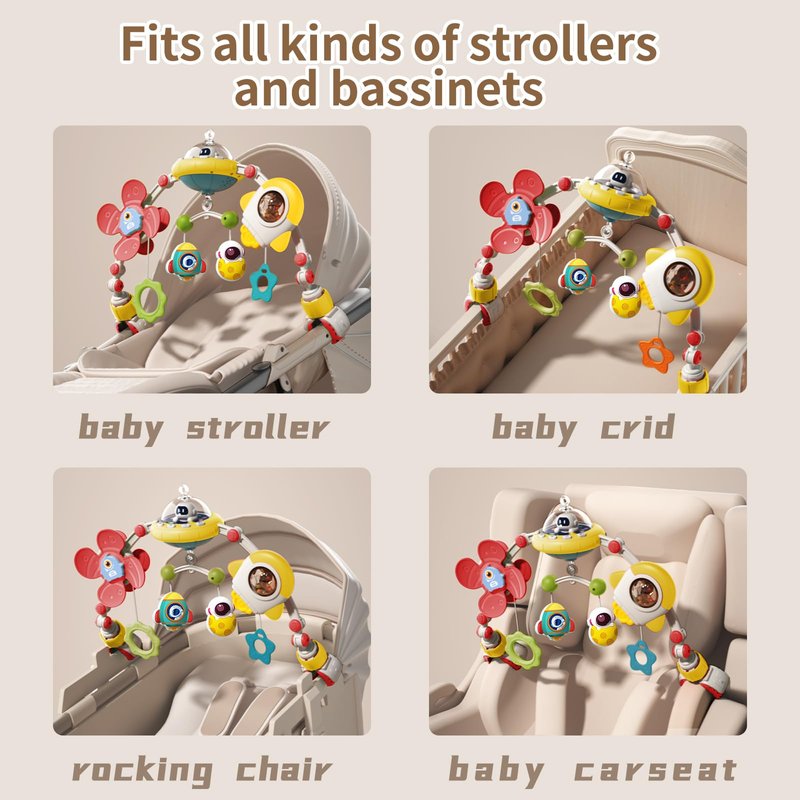 - Musical Baby Play Arch: Our baby stroller toy is an animal theme such as lovely rocket, spinning windmill, rotating plane and so on with multiple soft music accompanies your baby to sleep