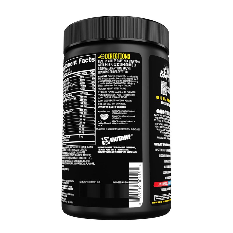 MUTANT GEAAR – THE COMPLETE EAA. Support your muscle growth and recovery with GEAAR, the most complete EAA supplement commercially available. Research has shown that 9 Essential Amino Acids (EAAs) plus Arginine are needed to build muscle and increase recovery. Very few EAA supplements contain Arginine which is a Conditionally Essential Amino Acid (CEAA) needed during overtraining and prolonged dieting but it also increases Insulin, Nitric Oxide and helps shuttle amino acids into muscle. GEAAR was formulated with 9.4 grams of EAAs plus Arginine, 7 grams of BCAAs and 4 grams of Leucine. GEAAR is also stacked with natural electrolytes to maximize performance with no artificial flavours, colours or dyes. GEAAR is made from vegan fermented amino acids and uses only natural colors and flavors to create our freak’n delicious taste! As an added commitment to our quality control, MUTANT has formed a strategic alliance with Informed-Choice to independently lab test our products for banned substances. All MUTANT supplements that carry the Informed-Choice logo are banned substance tested. The standard supplement screening test covers over 200 banned substances prohibited in sport. If it’s not on our label, it’s not in our product!** GEAAR contains no binders or fillers and is 100% instantized for maximum solubility. The formula also contains BioPerine which is a patented compound clinically proven to enhance nutrient absorption by up to 25%. Arginine works synergistically with BioPerine as a delivery system. Arginine increases Nitric Oxide which helps improve blood flow and nutrient delivery into muscle.*