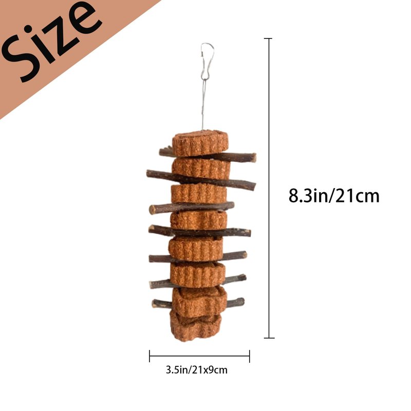 Our Rabbit Chew toy contains four 4 carrot-flavored molars chew toys measuring 8.3x3.5in/21x9cm. Unlike other kinds of grinding chew toys, ours is made of carrot powder and apple wood. The materials used are all natural, no added preservatives, which is healthy and harmless to pets. When you open the packaging, there will be a strong smell, which will be very attractive to your pet. Each carrot molar toy comes with a stainless steel hook that you can hang from your pet's cage. You can use a teeth-grinding toy to get closer to your pet and enhance your relationship. The role of grinding toys is to improve the health of teeth, relieve pet stress, help to relieve intestinal inflammation and mild inflammation, increase pet appetite. Perfect for guinea pigs, chinchillas, mice, hamsters, gerbils and other small animals.
