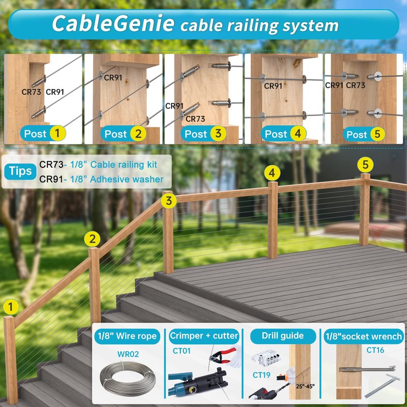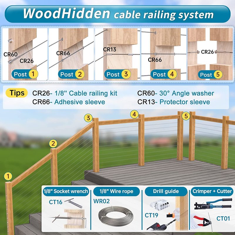- Advice for constructing a system - To help you construct a hidden neat-look wood system, we recommend the following product combinations from Muzata, including cable railing kit CR26, angled beveled washer CR60, 1/8” wire rope WR02, adhesive sleeve CR66, protector sleeve CR13, drill guide CT19, crimper and cutter CT01, socket wrench CT16.