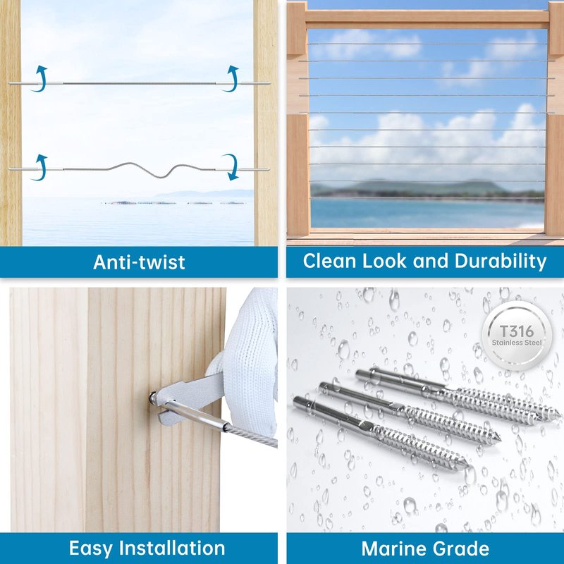- Left&Right Feature - Package comes with 10 left and 10 right hand lag screws for 10 cable runs, 1 drill bit, and 1 bent wrench. This cable railing kit is designed to rotate wire rope in the same direction to avoid twisting or damaging the wire rope. Professional hydraulic crimper Muzata CR09 is recommended
