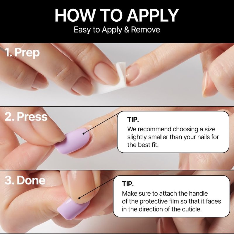 1. Wipe cleanly with a prep pad to remove oil and water from your nails. 2. Select the correct size nail tip and remove the protective film on the back. And attach nail tip. 3. Press the attached tip for 3 seconds. Trim tip ends with the wooden file as needed. 4. Apply a few drops of clean-off remover and gently push it off from the edge using the wooden stick.