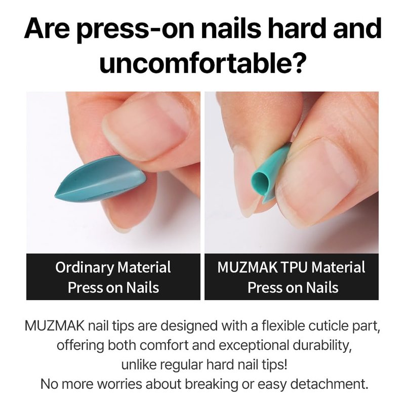 - REUSABLE FAKE NAILS: Muzmak press on nails are reusable, unlike traditional fake nails. Easily remove and reapply using nail adhesive for multiple uses without shape or quality compromise.
