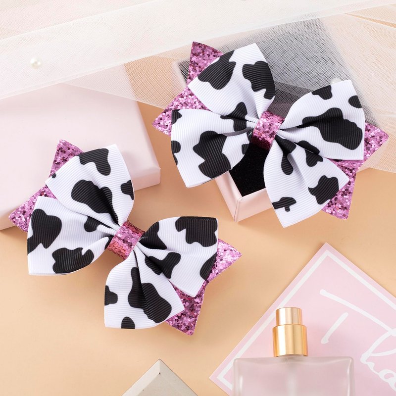 Mxxipp Cow Print Hair Bow Clips,2PCS Bow Hair Clips with Pink Grosgrain Ribbon,Cute Cow Print Clips Hair Accessories for Children Girls Birthday Party Decorat