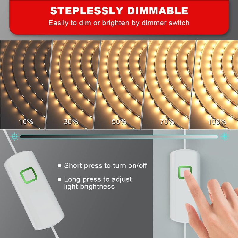 - Dimmable and Memory Function: The 12v led lights strip works with unique designed dimmer, long press dimmer to adjust light brightness (dim to bright), short press to turn on or off, and the smart led strip lights is also with memory function, which can restore to its last time color brightness to save your time effectively