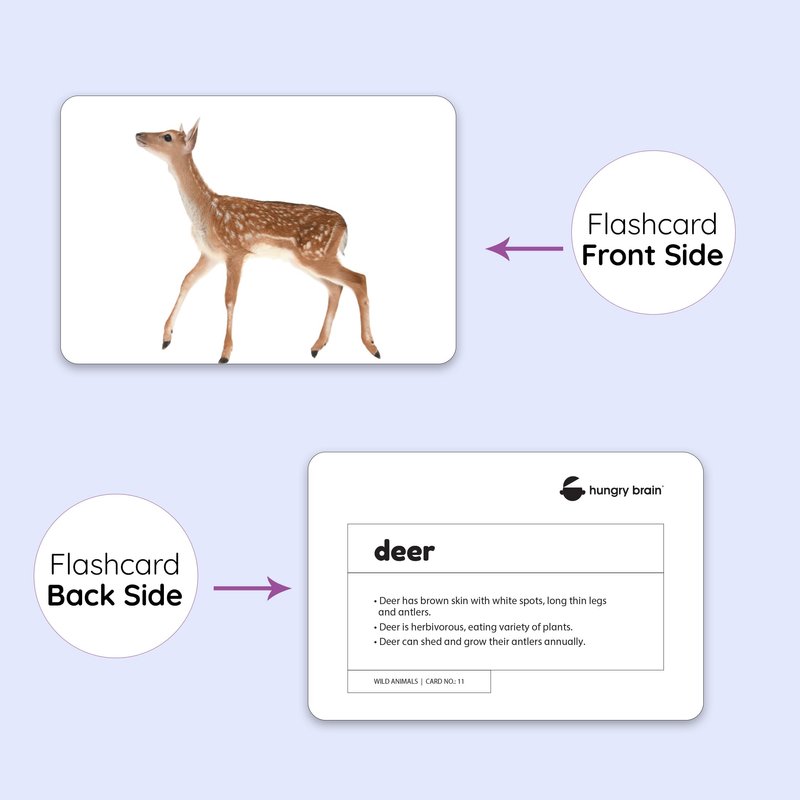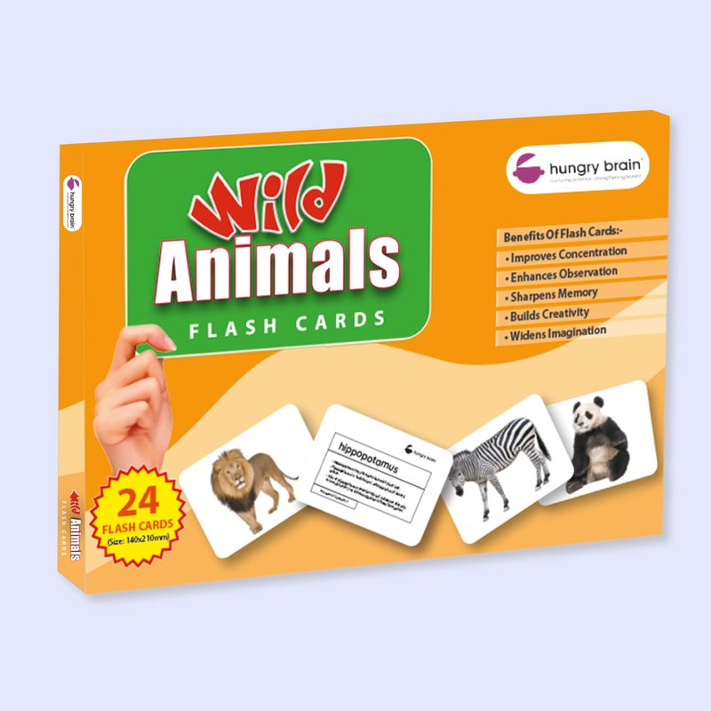 Total no of cards : 24 Material : Food Grade Paper Flash Cards Size : A5 (21 cm x 14 cm) Product Dimension : Length 21.5 cm Width : 14.5 cm, Height - 1 cm Flash cards are meant to be shown at a flashing speed, hence the name : flash cards. Hungry Brain cards do not have rings for flash cards as when in ring, it restricts the speed of showing the cards at 1 second/ card. Ideally 24 cards of Fruits flashcards are to be shown in less than half a minute. To develop a good photographic memory for life, show each set of flash cards 3 times a day for a week. Appreciate the baby/ toddler/ child after every session of the flashcards. This appreciation will develop a strong bond for learning in life. After a month, say 3-5 words from 1st point of description from the back side of the card for a week. Next month, say 3-5 words from 2nd point of description from the back side of the card for a week. Next month, say 3-5 words from 3rd point of description from the back side of the card for a week. After completing 3 points, write the name of the action in the front and show or stick the cards on the wall for a week. This will enable the child to associate the word with the image thus building early reading skills for babies, toddlers and young children. These set of cards will be treasure for your child even after some months when they will be able to read the description by their own. Activity for toddler: Act a particular action and tell the baby to guess what kind of animal is this. You can also say a name and the child with do the action for the animal. children love this kind of activity with the learning from the flashcards. This will develop communication skills, critical thinking skills, verbal concepts, enhance conversations and strengthen reasoning ability at a young age. FACT: Younger the baby, better the learning.