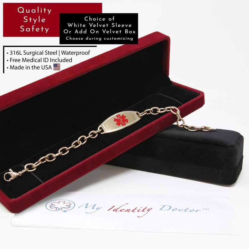 This medical ID bracelet is made from 316L with a rose tone and large O-Links. ID plate is medium in size and due to the size of the chain, this may not be suitable for women and teens that want a small medical bracelet. Though this O-Link style is a very popular style for women.