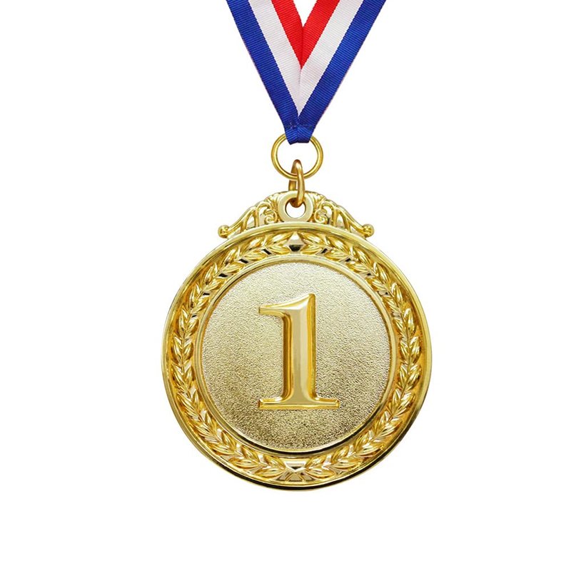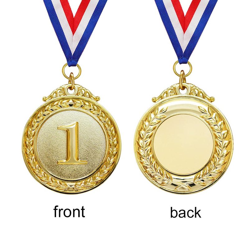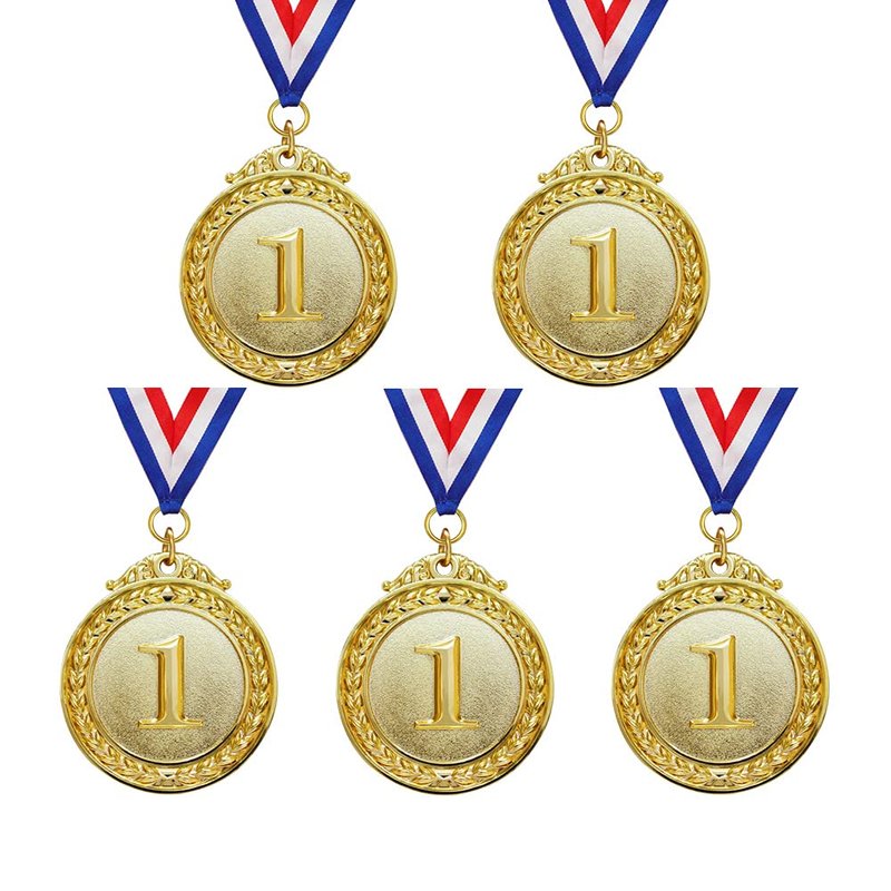 5-PACK GOLD AWARD MEDALS: This set includes 5 Olympic style gold medals representing the highest achievement for various types of competitive activities. BEAUTIFULLY DESIGNED: These award medals are crafted of zinc alloy, intricately designed with floral borders and feature '1st' embossed in the center. The red, white, and blue neck ribbons are made of polyester. SYMBOL OF ACHIEVEMENT: Reward your winners with the symbol of success and achievement. PERFECT FOR ANY EVENT: Award of choice for party games, spelling bees, talent shows, relay races, animal shows, festivals, and even chili cook-offs! DIMENSIONS: Medals measure 50mm in diameter. Neck ribbon measures 80mm in length.