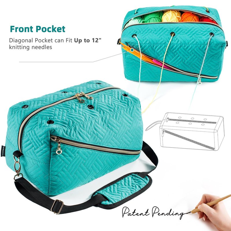 - 🧶【NO TANGLED YARN】 - Large size crochet bag is With 6 metal stainless grommets, Designed to keep your yarn tangle-free and easy to access with grommets to prevent yarn threads from tangling. One diagonal pocket can fit up to 12" knitting needles.
