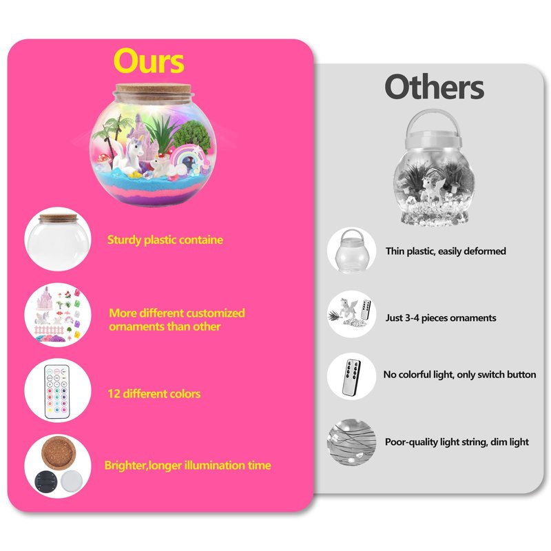 - 【Inspires Creativity】Let your child unleash their imagination by building their own unicorn garden. Our Unicorn Terrarium Kit provides a variety of materials, such as magic sand, unicorn figurines, castle, and more, offering children a magical world where they can create their own enchanted garden