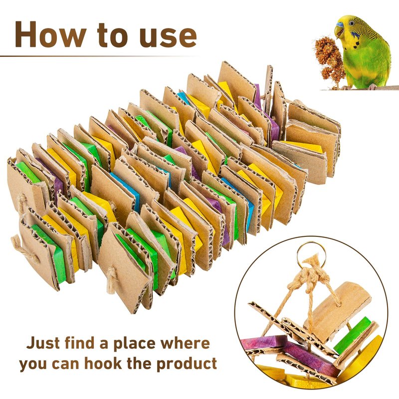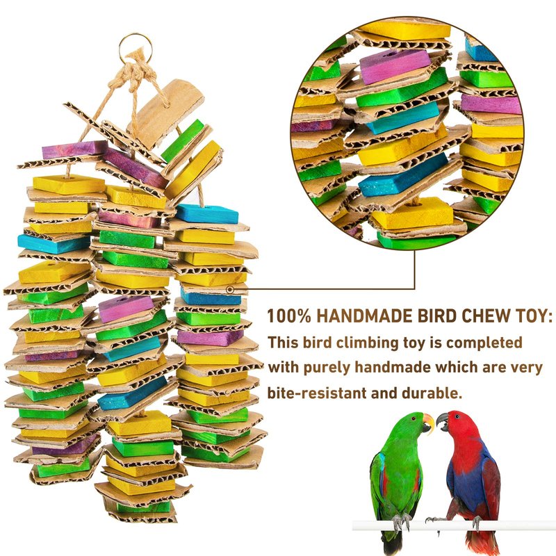 Multiple benefits Birds love pecking and chewing. The parrot toys are made of 100% natural wood and cardboard, safe and durable. Your pet bird can play them without any misgivings. Parrot bite toy can reduce the aggression and loneliness of your bird. Multi-layer design. These blocks are arranged in multiple layers to climb and explore.