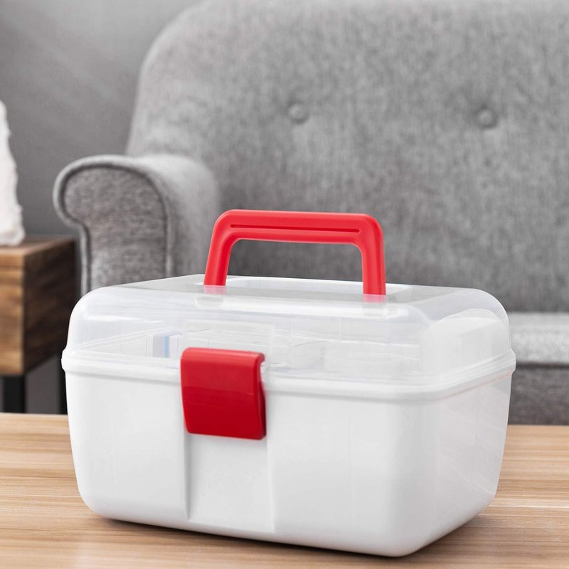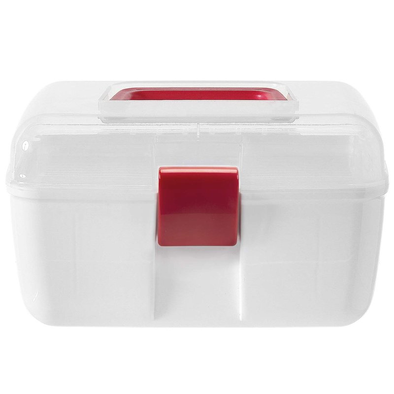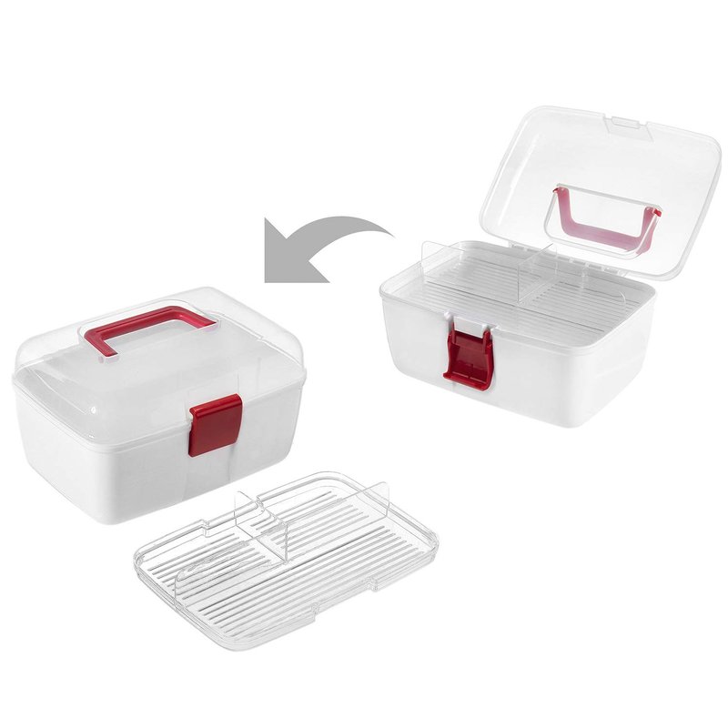 Keep your medical supplies conveniently on hand for any emergency situation with this clear top first aid kit travel case. Featuring a durable premium quality plastic construction, this portable family emergency kit tackle box features a detachable tray with compartments for storing ointments, bandages, gauze, cleaning solutions, and much more, which can be easily removed from the first aid travel case to store additional supplies. Its folding top red handle allows you to easily carry your medical accessories wherever you need to go, and features a locking latch to keep your supplies secure during transport. Not only can this carrier be used for first aid supplies, it is great for storing arts and crafts, makeup, and other hobbies or interests. Perfect for keeping your first aid supplies accessible in your car, home or office, this portable first aid travel storage box is an indispensable medical accessory for any emergency situation.