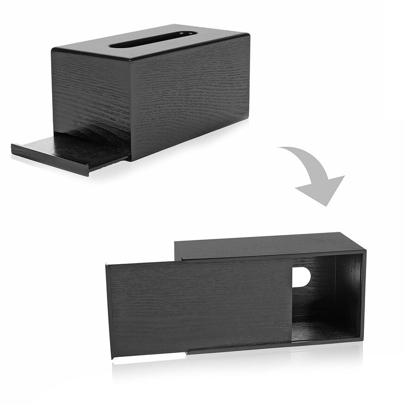 Store your facial tissues the stylish way with this elegant tissue box. Made of wood, this decorative tissue holder features a black finish with a natural wood grain texture. Fill this tissue box by simply sliding back the bottom panel and placing a box or stack of tissues inside, and then take advantage of the top opening to retrieve a facial tissue whenever you need one. For a stylish way to keep tissue close at hand in any room, this wooden tissue holder is the perfect choice.
