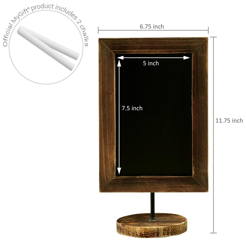 Get customized displays in modern rustic style using this charming set of 2 12-inch wooden chalkboard signs for events, businesses, or daily home use. Each countertop memo board features a rectangular frame measuring 1 inch wide crafted of burnt finished wood, supported by a black metal rod on a circular wooden base. The 4.75-by-7.75-inch erasable black chalkboard surfaces provide a smooth canvas for clear and legible writing, creating an excellent contrast for white or colored chalk when jotting down menus, recipes, notes, love letters, or artistic creations. Versatile and reusable, these small standing chalkboards are ideal for reminders, shopping lists, decorative photography props, chalk art canvases, and informative signs at parties such as weddings, birthdays, and graduations, or in business settings like restaurants, bars, coffee shops, or food trucks. Whether used for milestones, charity fundraisers, bake sales, school dances, art expos, festivals, banquet buffets, or farmers market vendors, these compact yet impactful pair of chalkboard stands offer an attractive design that won't overwhelm tabletop surfaces. With a touch of farmhouse charm, this signage duo is a thoughtful gift, enhancing any special occasion, holiday, or everyday decor with their weathered wood appeal.