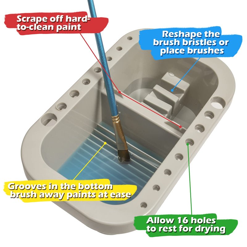 - This paint brush cleaner features a lid, a paint palette and a brush wash basin for water and mixing