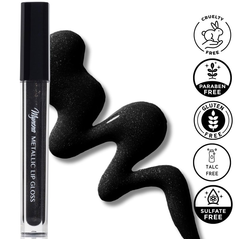 Mynena Diamond Lips | Black with Silver Metallic Finish Lip Gloss | High-Shine, Non-Sticky, Non-Drying | Lipstick Topper | Ebony