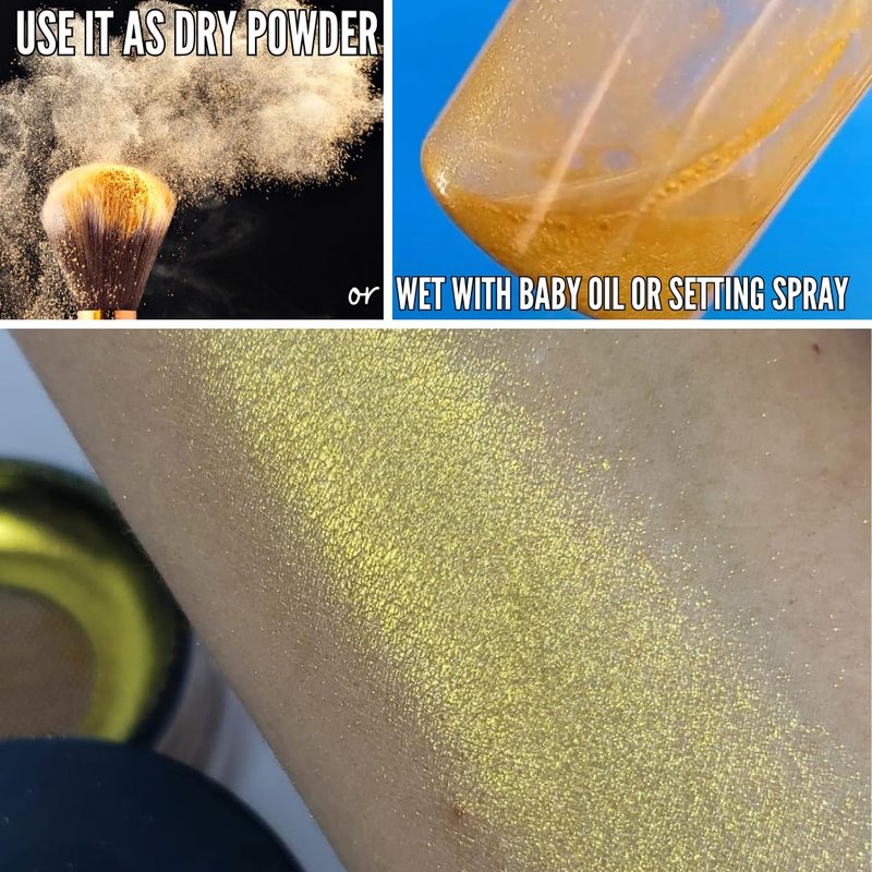 - Wet or dry for different effects: Mix this shimmering loose pigment with your favorite oil or moisturizer to create a glow balm or shimmering spray. Create your custom shade by mixing it with powder eyeshadow or blush. Smooth application formula melt onto the skin for a weightless feel, suitable for all skin types and tones