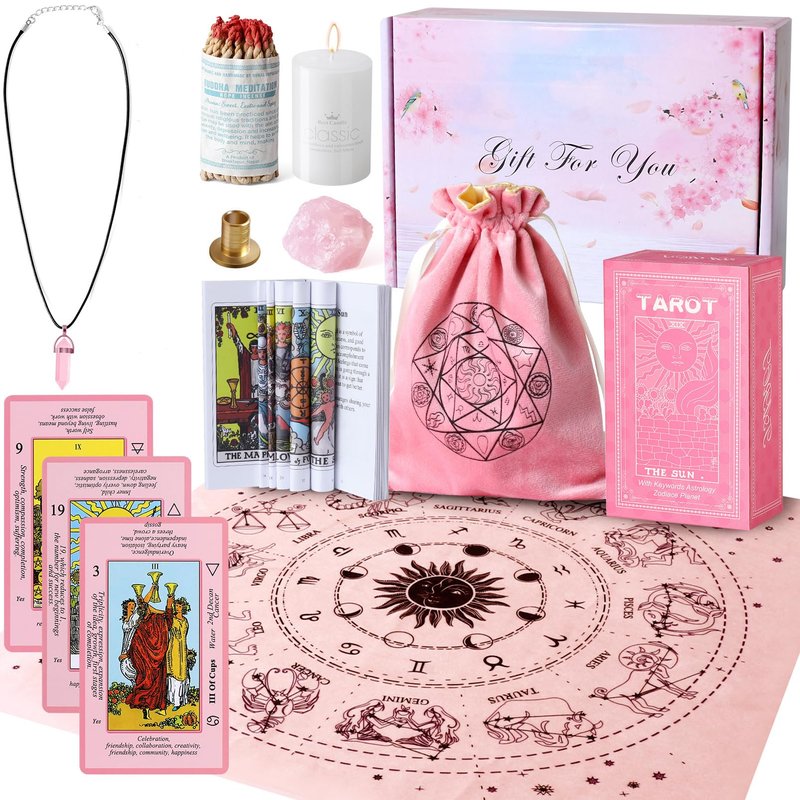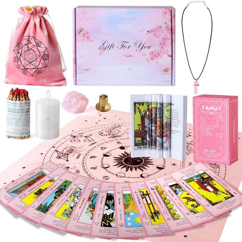 - Premium Fortune Telling Toys Set -- 9 Pcs Fortune Telling Toys Box Include 1 deck of 78 tarot cards .1 Natural Original Pink crystal Chakra Stones.1 Spirit Pendulum.1 Tarot Velvet Cloth .1 Velvet Linded Bag.1Pack Rope Incense ,1 Mini Incense Holder. 1 Candel .cards: Size 2.87"x4.72"inch